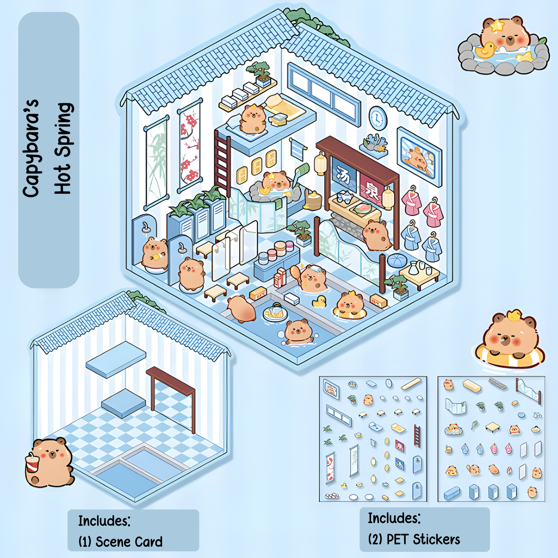 Step into a peaceful little retreat where gentle capybaras soak away their worries in warm, steamy springs. Capybaras Hot Spring is a soothing miniature scene inspired by traditional Japanese onsen culture — complete with tiny wooden tubs, soft lantern light, natural stone textures, and adorable capybara characters relaxing in pure bliss. Every detail feels calm, cozy, and full of quiet charm.