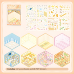 Each design consists of (1) Scene Card, and (2) PET Sticker Sheets.