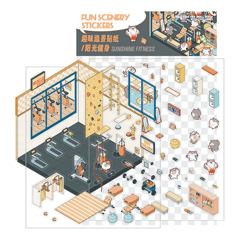 A bright, energetic little gym scene you can build sticker by sticker. Sunshine Fitness is a playful, sticker‑layering kit that lets you create your own tiny workout studio — weights, mirrors, plants, and all the soft, sunny details that make the space feel warm and welcoming.